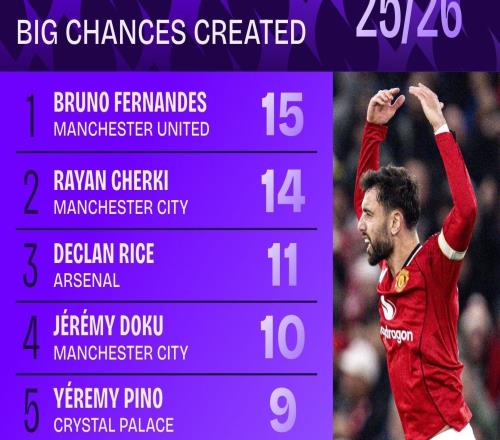 本赛季英超创造绝佳机会排名:B费15次居首,谢尔基次席